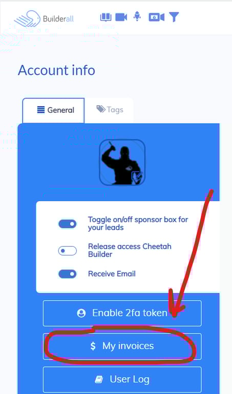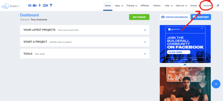 In the Builderall dashboard, select “Account” on the main menu at the top right.