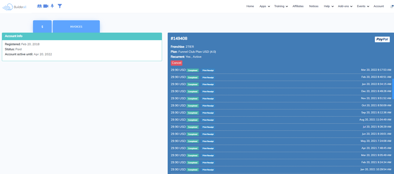 Go to the top menu in the Builderall dashboard and choose "Account"