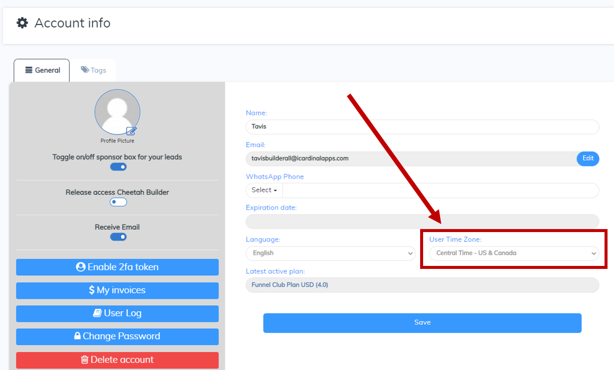 In the Account Info area on the general tab, you can change the user time zone settings by clicking the down arrow and choosing the correct time zone.