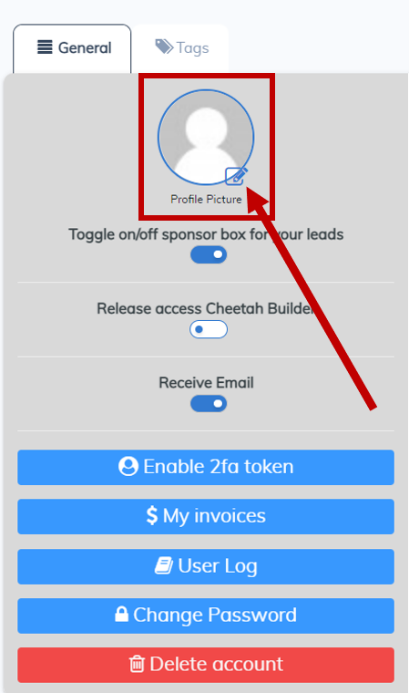 In the Account Info area on the general tab, click the icon that is in the corner of your profile image