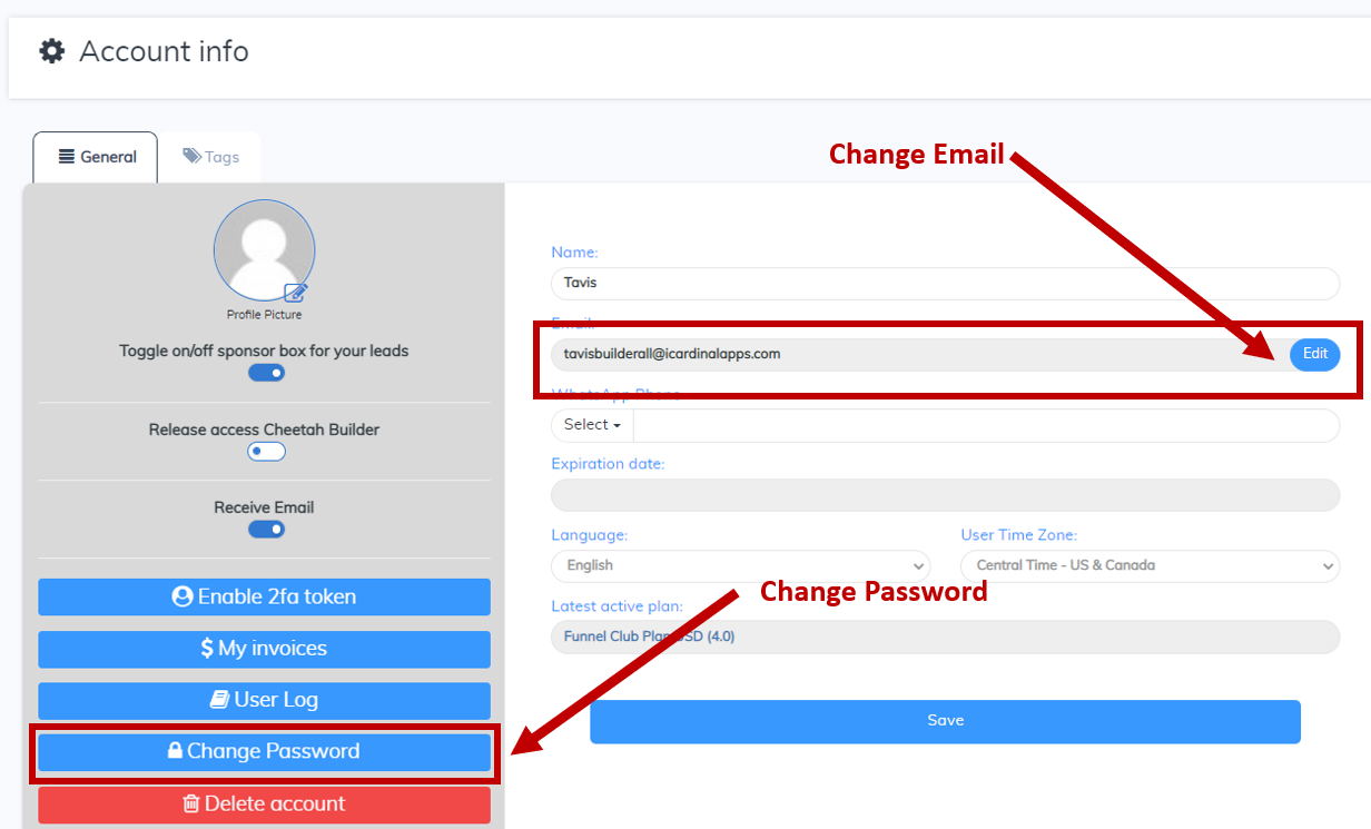 In the "Account Info" area in the general tab, you can edit your email or change your password.