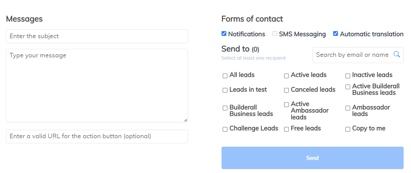 NOTE: If you chose "notifications", the message will appear as a dashboard notfication. If you chose "SMS messaging", the person will get an SMS text message they have added their phone number to their personal profile and you have SMS credits available. If you chose "automatic translation" our system will use Google Translate to translate your message and deliver it to the recipient.