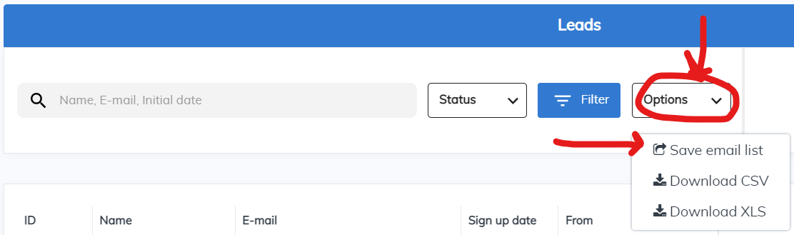 On the page, in the Leads section, choose "Options" and then "Save email list"