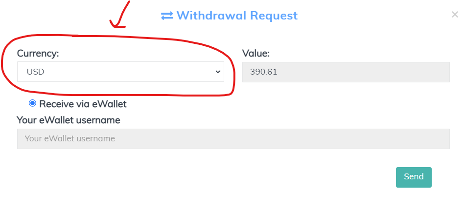 To request a withdraw, click the "Withdrawal Request" button and verify the information in the form for your withdrawal. If you have commissions from multiple currencies, you will have the ability to choose the currency you want to request withdrawal. Once you request a withdrawal, it will be paid to you on the regular Thursday pay day.