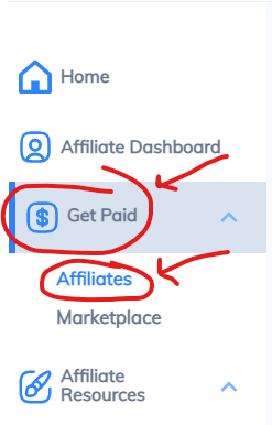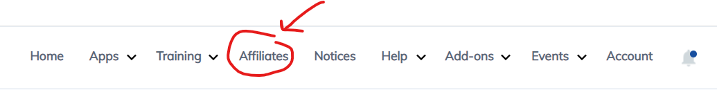 To get paid your commissions, you need to first go to the affiliate dashboard. To get there, click "Affiliates" on the top main menu in the dashboard.